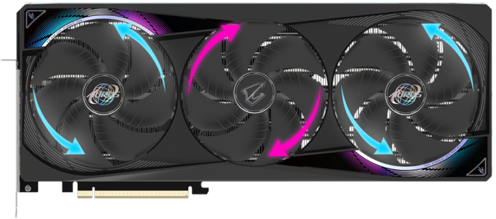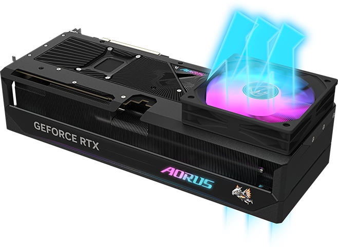 Система охлаждения WINDFORCE обеспечивает исключительную тепловую эффективность благодаря сочетанию передовых технологий. Она включает в себя композитную металлическую смазку, теплопроводящий гель серверного класса, инновационные вентиляторы Hawk с попеременным вращением, композитные медные тепловые трубки, большую паровую камеру, 3D-вентиляторы с активным охлаждением и улучшенное экранное охлаждение.