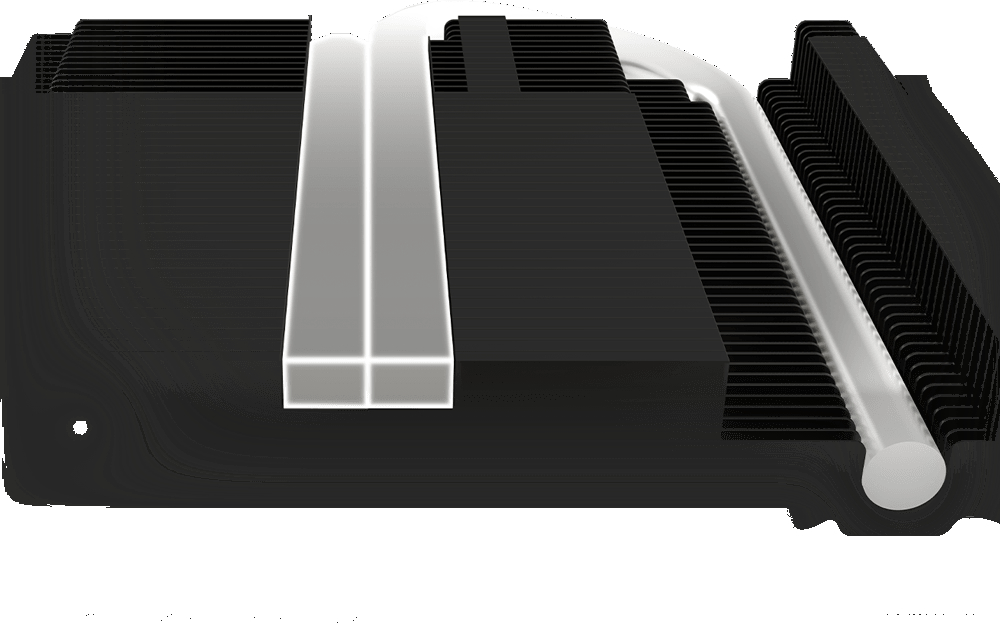 Квадратное сечение тепловых трубок Core Pipes максимизирует контакт с испарительной камерой для лучшего охлаждения.
