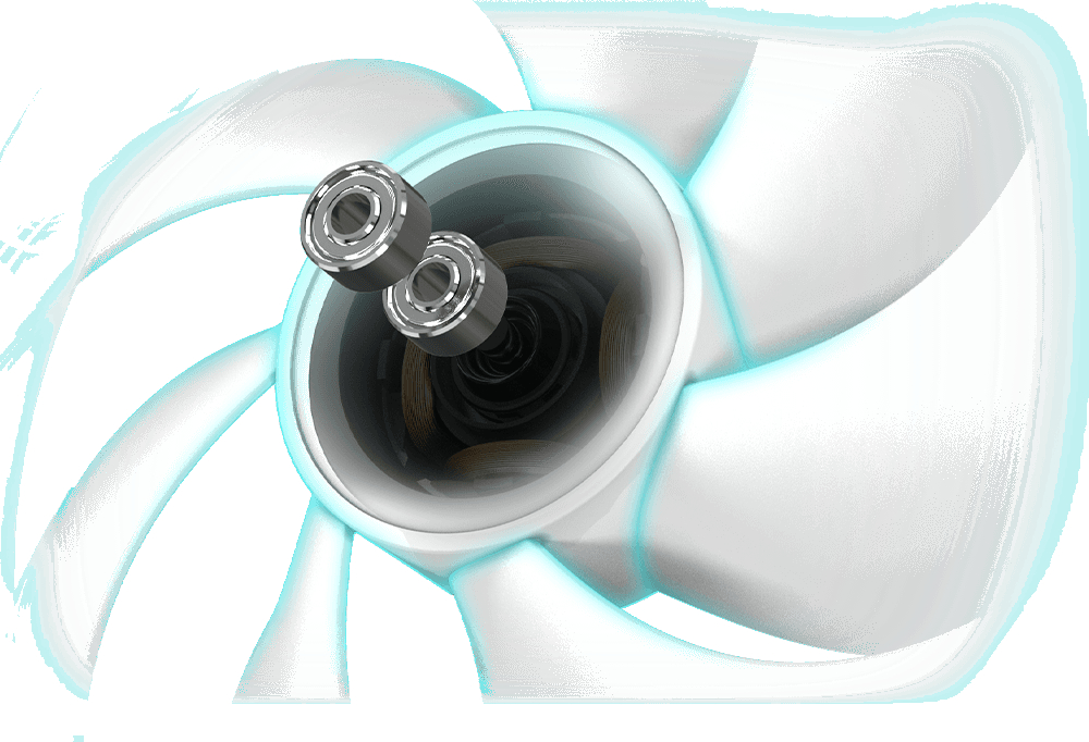 Два комплекта надежных шариковых подшипников обеспечивают работу вентиляторов в течение многих лет интенсивных и длительных игровых сессий.