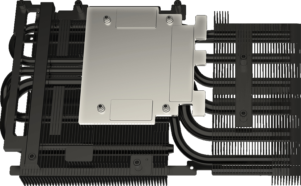 Тепло от графического процессора и модулей памяти быстро улавливается прочной никелированной медной контактной пластиной и передается к тепловым трубкам.