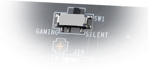 Переключатель BIOS дает вам возможность отдать предпочтение максимальной производительности в режиме GAMING или низкому уровню шума в режиме SILENT.