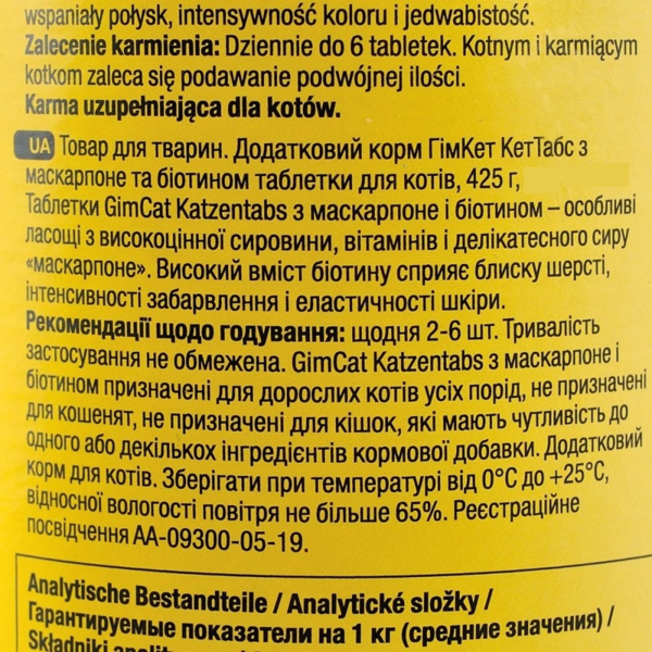 - Витамины для котов GimCat Katzentabs с маскарпоне и биотином 425 г