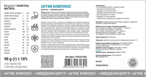 | Состав | Дрожжи пивные, витаминно-минеральный комплекс, дикальция фосфат, кальция цитрат, сухие экстракты: аболона, плодов клюквы, корня топинамбура, солода, зеленых губчатых моллюсков; пробиотические бактерии (Bacillus subtilis), таурин, микрокристаллическая целлюлоза, крахмал картофельный, кальция стеарат, гипромелоза, ароматизатор пищевой «сливки» |