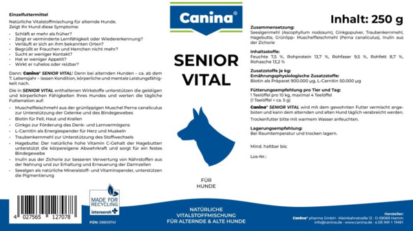 Senior Vital для собак старшего и пожилого возраста — это минеральный комплекс, который содержит смесь жизненно важных веществ. У собак почтенного возраста (начиная с 7-летнего возраста) снижается физическая и умственная работоспособность, замедляются все метаболические процессы. Собаки крупных пород стареют раньше, чем собаки малых пород. Senior Vital это натуральная смесь жизненно важных веществ с витаминами, минералами и микроэлементами, которая поддерживает собак старшего возраста физически и умственно.