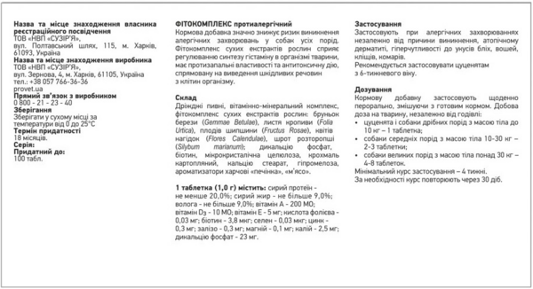 - Витамины для собак ProVET Фитовит фитокомплекс противоалергический 100 табл