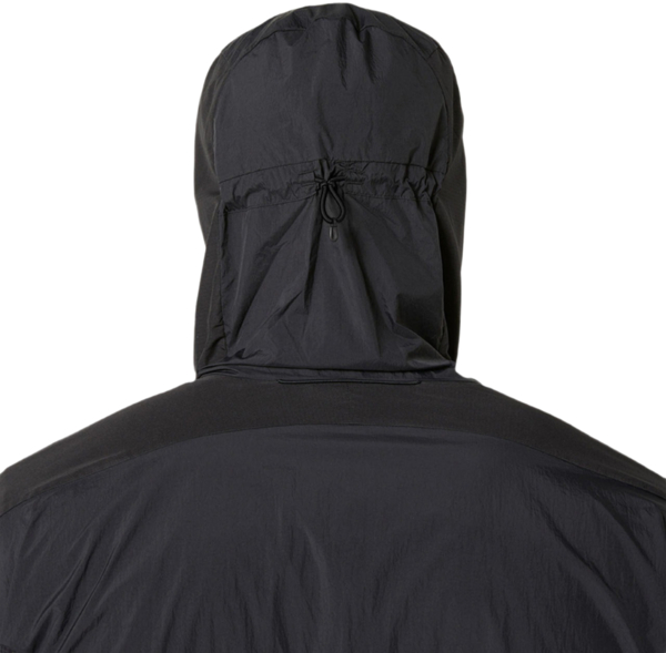 - Капюшон имеет шнурки для регулировки посадки, а нижний край дополнен утягивающим шнуром для более точной фиксации во время движения;