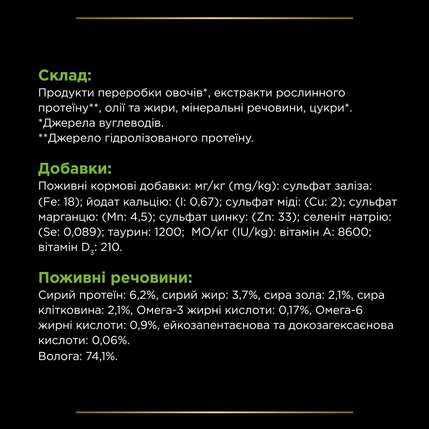 | Пищевые добавки | МЕ/кг (IU/kg): витамин А: 8600; витамин D3: 210; мг/кг (mg/kg): сульфат железа: (Fe: 18); йодат кальция: (I: 0,67); сульфат меди: (Cu: 2); сульфат марганца: (Mn: 4,5); сульфат цинка: (Zn: 33); селенит натрия: (Se: 0,089); таурин: 1200 |