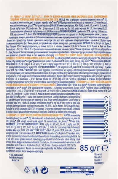 Purina CAT CHOW. С ягненком и зеленой фасолью. Нежные кусочки в желе. Консервированный порционный полнорационный корм для взрослых котов.Ваш кот - невероятный. Для того, чтобы помочь ему сохранить эту природную удивительность, мы разработали корм CAT CHOW, в состав которого входит качественный протеин, натуральные ингредиенты. Опираясь на наш опыт в области питания кошек с 1926 года, мы разработали полнорационный, сбалансированный корм Purina CAT CHOW, который содержит все необходимое для того, чтобы ваша кошка имела полноценную и здоровую жизнь.