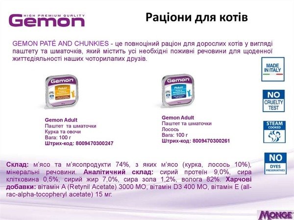 GEMON CAT паштет и кусочки с курицей и овощами - это полнорационный корм для взрослых котов, разработанный, чтобы удовлетворить все потребности в необходимых питательных веществах. Для здоровой, ежедневной жизнедеятельности наших четвероногих друзей.
