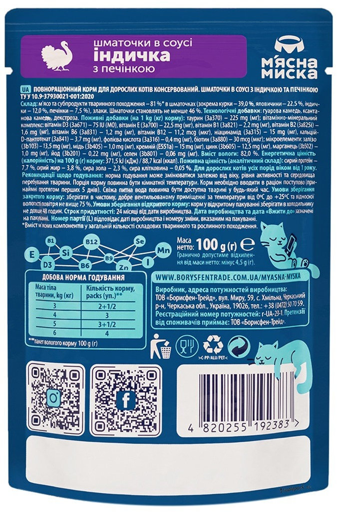 - Влажный корм для котов Мясная Миска с индейкой и печенью 100 г