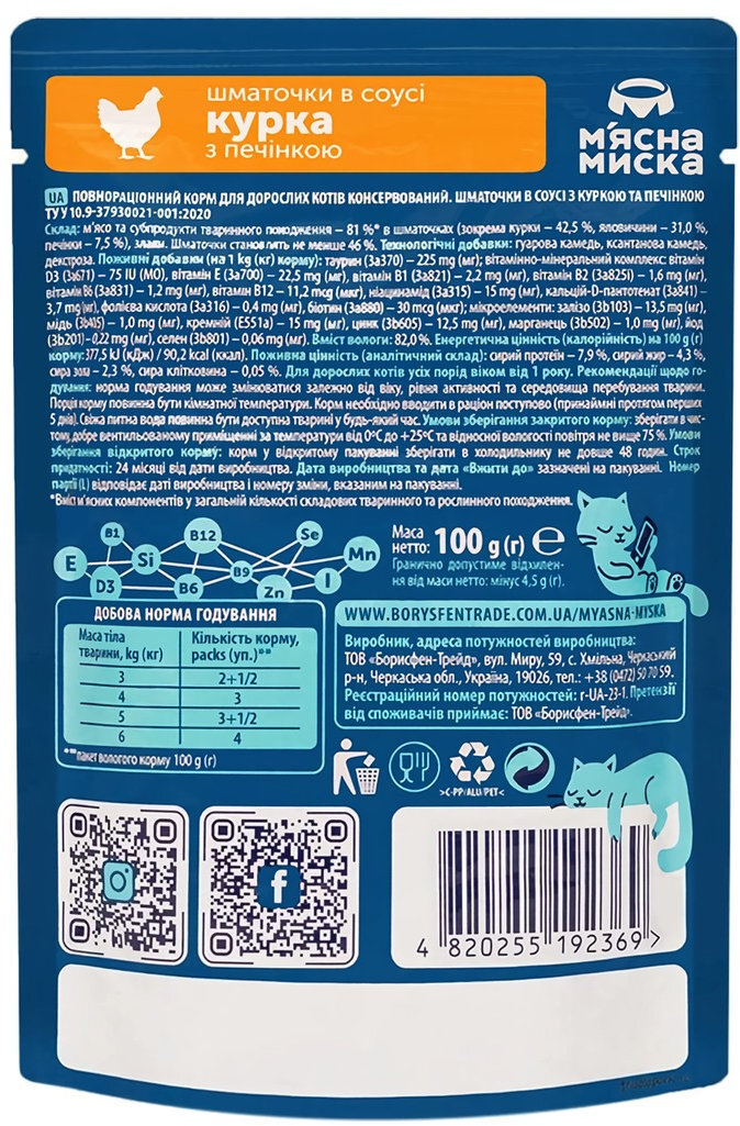 - Влажный корм для котов Мясная Миска с курицей и печенью 100 г