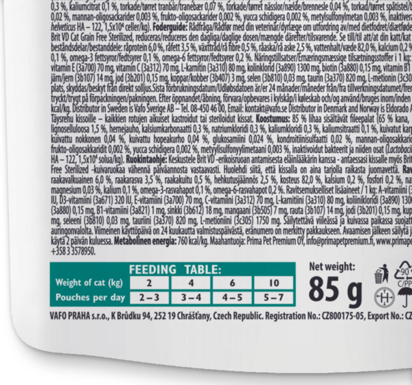Относительно кормления диетическим кормом Brit VD проконсультируйтесь со своим ветеринаром - при сочетании с сухим кормом Brit VD Cat Grain Free Sterilized соответственно уменьшите суточную дозу. Стоит позаботиться, чтобы у Вашей кошки всегда была свежая питьевая вода.