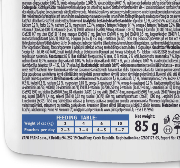 Относительно кормления диетическим кормом Brit VD проконсультируйтесь со своим ветеринаром - при сочетании с сухим кормом Brit VD Dog Grain Free соответственно уменьшите суточную дозу. Сначала кормите во время восстановления или для достижения желаемого веса. Во всех случаях перед использованием или перед продлением срока использования рекомендуется обратиться за консультацией к ветеринарному врачу. Стоит позаботиться, чтобы у Вашей кошки всегда была свежая питьевая вода.