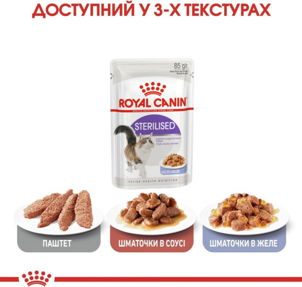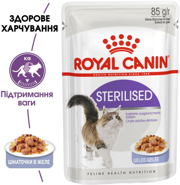 Royal Canin Sterilised - полнорационный влажный корм (кусочки в желе) для стерилизованных кошек в возрасте от 12 месяцев.