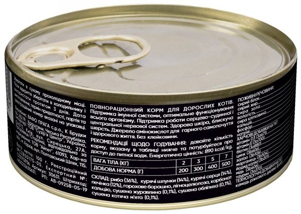 Рыба (36%), куриные желудки (14%), куриные сердца (14%), печень (12%), гороховая мука, лигноцеллюлоза, карбонат кальция, сушеная клюква (0.1%), сушеная облепиха (0.1%), сушеная кошачья мята (0.1%).