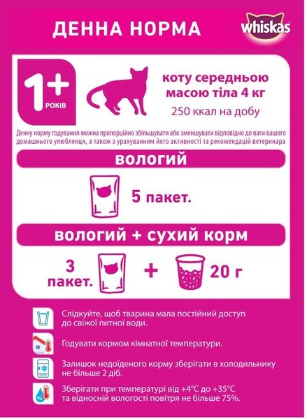 С 12 месяцев и старше начинайте кормить ваше животное кормом для взрослых котов (1+). Большинству котов нужно время для постепенной смены диеты. Корректируйте количество корма в зависимости от потребностей вашего кота. Для котов с избыточным весом уменьшайте суточную норму корма. Следите, чтобы у животного всегда был свободный доступ к свежей питьевой воде. Давать корм животному нужно комнатной температуры. Остаток влажного корма, который не доело животное, необходимо хранить в холодильнике не более 2 дней. Готовые корма подлежат строгой дозировке на вес животного! Корма нужно хранить в закрытом виде при температуре от +4 до +35°С и относительной влажности воздуха не более 75%.