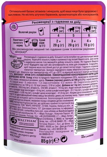 Нежный крем-суп с говядиной — это сытный и полезный обед для вашей кошки. Влажный рацион WHISKAS Крем-суп с говядиной для взрослых кошек, 85 г содержит необходимые питательные вещества и витамины. Чтобы ваша любимица всегда была здоровой и довольной.