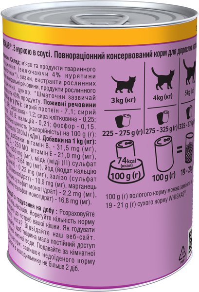 Влажные рационы WHISKAS с курицей в соусе для взрослых кошек, 400 г — это сбалансированный рацион для вашей любимицы. Питание с курицей в нежном соусе содержит оптимальный баланс витаминов и минералов для поддержания здоровья вашей кошки каждый день. Кроме того, формат банки очень удобный в использовании.