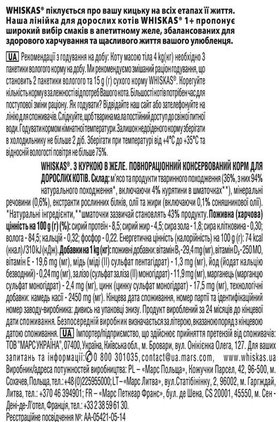 - Влажный корм для котов Whiskas пауч курица в желе 100г