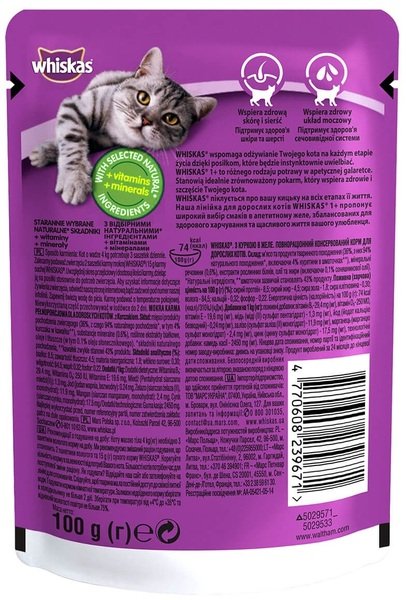 Полнорационный консервированный корм для взрослых кошек в возрасте от 1 года до 7 лет. Выбирая корм для кошек, учитывайте возраст, поведение, а также вкусовые предпочтения вашего питомца! Влажные рационы Whiskas это богатый ассортимент вкусов, разнообразные текстуры, натуральные ингредиенты и настоящее удовольствие для вашего котика.