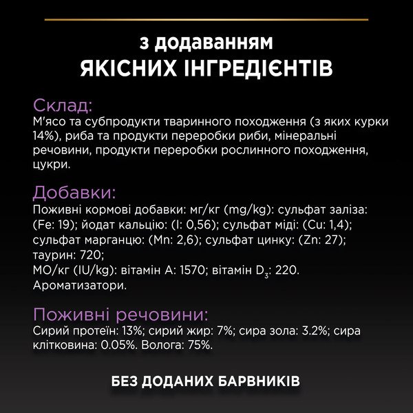 | Пищевые добавки | МЕ/кг (IU/kg): витамин А: 1570, витамин D3: 220, мг/кг (mg/kg): сульфат железа: (Fe: 19), йодат кальция: (I: 0.56), сульфат меди: (Cu: 1.4), сульфат марганца: (Mn: 2.6), сульфат цинка: (Zn: 27), таурин: 720, ароматизаторы |