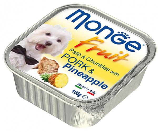 - К преимуществам корма MONGE DOG FRUIT со свининой и кусочками ананаса можно смело отнести высокую калорийность, а значит быстрое насыщение организма животного.