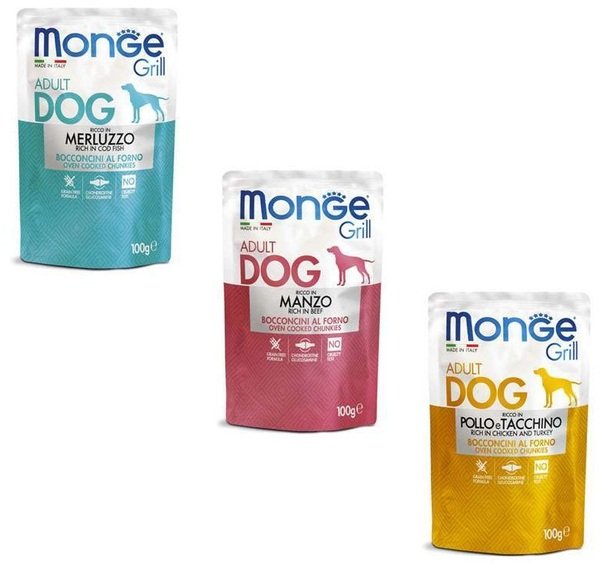 - Влажный корм для собак Monge Dog Grill Mix Chicken and Turkey, Beef, Cod Fish с треской, индейкой и курицей 1,2 кг