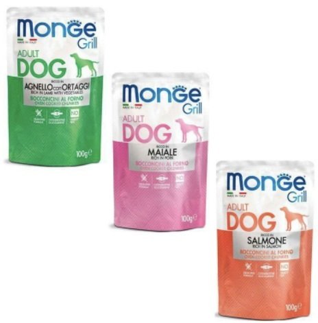 - Влажный корм для собак Monge Dog Grill Mix Lamb&Pork&Salmon с лососем, ягнёнком, свининой 1,2 кг