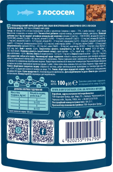 Подарите своему четвероногому другу настоящее наслаждение океана! Мясная Миска «Кусочки в соусе с лососем» - это нежные и аппетитные кусочки отборного лосося, залитые ароматным соусом. Этот полноценный рацион в удобной упаковке не только удовлетворит изысканный вкус вашего любимца, но и обеспечит его ценными Омега-3 жирными кислотами для здоровой кожи и блестящей шерсти.