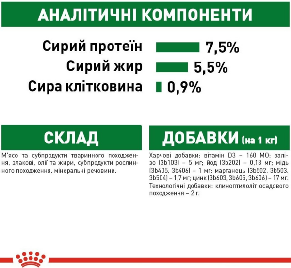 | Состав | Мясо и субпродукты животного происхождения, злаковые, масла и жиры, субпродукты растительного происхождения, минеральные вещества |
