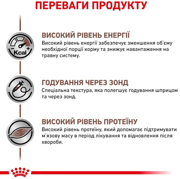 Влажный корм для взрослых собак для восстановления после болезни. Также рекомендуется при нарушениях пищеварения и проблемами с дефекацией. Помогает поддерживать мышечную массу в период выздоровления или лечения. Подходит для кормления шприцем и через зонд благодаря специальной текстуре. Снижает нагрузку на пищеварительную систему благодаря своей высокой питательности, позволяет уменьшить порцию для кормления. Обеспечивает дополнительным уровнем энергии и поддерживает защитные функции организма.