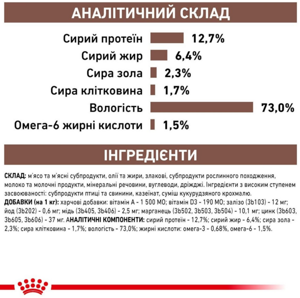 | Состав | Мясо и мясные субпродукты, масла и жиры, злаковые, субпродукты растительного происхождения, молоко и молочные продукты, минеральные вещества, углеводы, дрожжи. Ингредиенты с высокой степенью усвояемости: субпродукты птицы и свинины, казеинат, смесь кукурузного крахмала. |