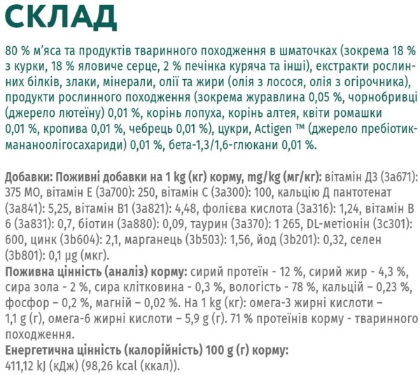 | Состав | 80% мяса и продуктов животного происхождения в кусочках (в том числе 18% из курицы, 18% говяжье сердце, 2% печень куриная и другие), экстракты растительных белков, злаки, минералы, масла и жиры (масло из лосося, масло из огуречника), продукты растительного происхождения (в частности клюква 0,05%, бархатцы (источник лютеина) 0,01%, Корень лопуха, корень алтея, цветы ромашки 0,01%, крапива 0,01%, тимьян 0,01%), сахара, Actigen (источник пребиотик-мананоолигосахариды) 0,01%, бета-1,3/1,6-глюканы 0,01% |