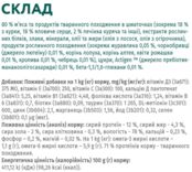 | Пищевые добавки | Витамин Д3 (3a671): 375 МЕ, витамин Е (3a700): 250, витамин C (3a300): 100, кальция Д пантотенат (3а841): 5,25, витамин В1 (3а821): 4,48, фолиевая кислота (3а316): 1,24, витамин В6 (3а831): 0,7, биотин (3a880): 0,09, таурин (3a370): 1 265, DL-метионин (3с301): 600, цинк (3b604): 2,1, марганец (3b503): 1,56, йод (3b201): 0,32, селен (3b801): 0,1 мкг (мкг) |