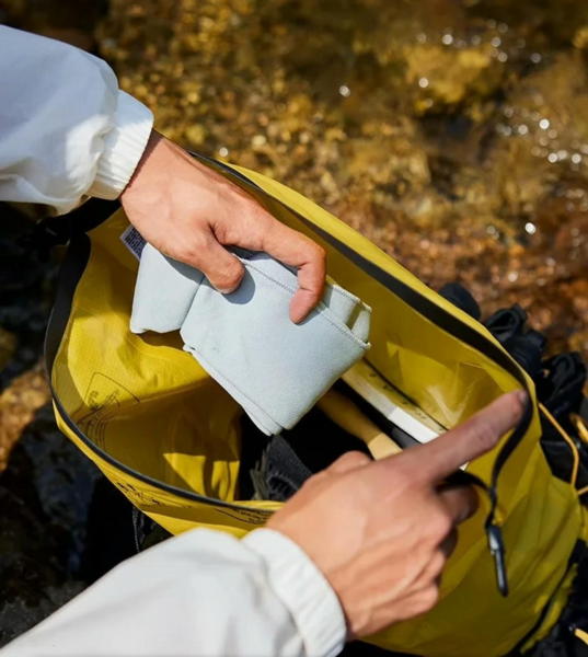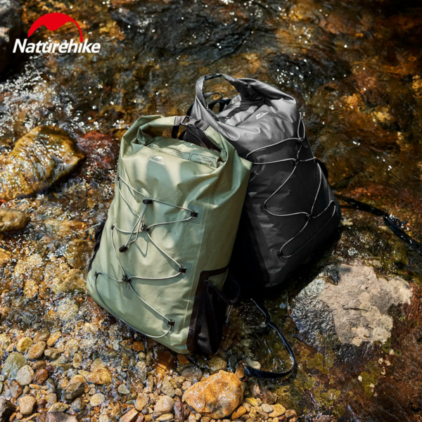 На передней части рюкзака имеются завязки, которые помогают зафиксировать обувь или мокрую одежду. Таким образом, есть возможность отделить сухие вещи от мокрых. По бокам изделия размещаются сетчатые карманы для бутылок с водой. Для более комфортного использования есть кармашек внутри, он может использоваться для хранения документов или белья. Открыть и закрыть рюкзак очень просто путем скручивания верхней части.