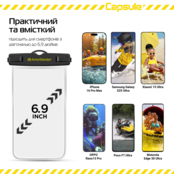 Capsule Waterproof Case достаточно вместителен, что делает его универсальным для всех типов смартфонов с диагональю до 6.9 дюймов. А также чехол не только защитит ваше устройство, но и ключи, деньги, документы или другие важные вещи.