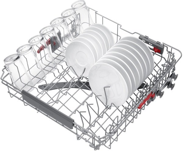 Помещайте разнообразную посуду, стаканы и чашки легче и безопаснее. Угол зубцов в средней корзине можно регулировать в 3 положениях с помощью рычага сзади. Зубцы нижней корзины также складываются, чтобы поместить большую посуду. А подставка для стаканов безопасно удерживает деликатные предметы.