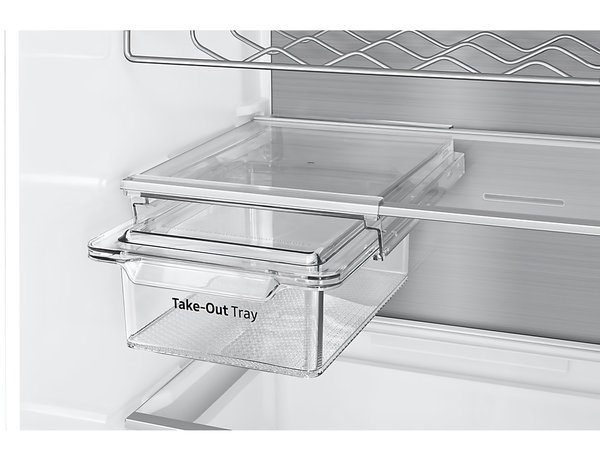 Самсунг включает в свое оснащение три основные полки, выполненные из крепкого закаленного стекла. Также есть несколько полок на дверце, лоток для яиц, металлическая подставка для бутылок. В морозильном отделении присутствует одна полка и две прозрачные пластиковые камеры для хранения продуктов.