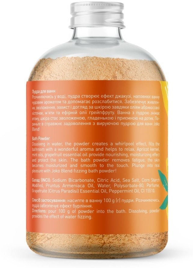 Растворяясь в воде, пудра создает эффект джакузи, наполняет ванну восхитительным ароматом и помогает расслабиться. Обеспечивает питание, увлажнение, защиту и уход за кожей благодаря маслам абрикосовых косточек, мяты и эфирному маслу грейпфрута. Ванна с пудрой снимает усталость, кожа становится увлажненной, гладкой и приятной на ощупь.
