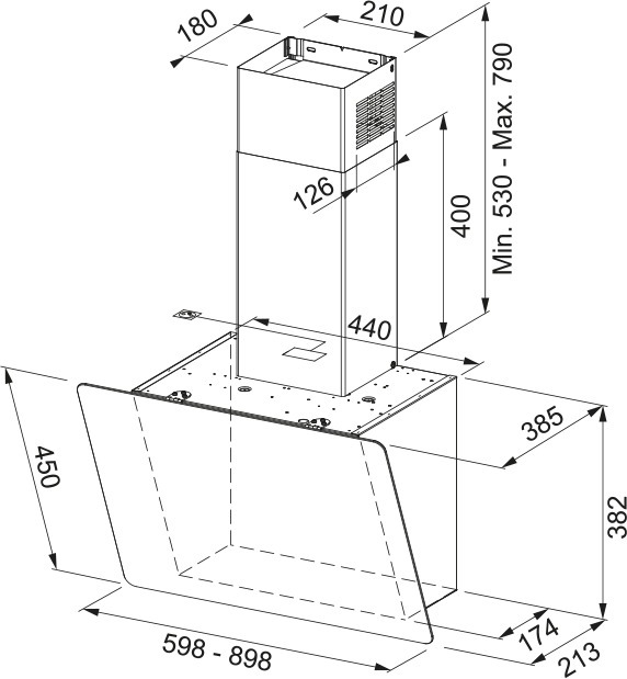 Вертикальная вытяжка с наклонной стеклянной панелью не имеет выступающих частей, поэтому ухаживать за вытяжкой чрезвычайно просто. Стекло прекрасно моется и неприхотливое к бытовой химии. Стеклянная панель имеет возможность фиксироваться в открытом состоянии, что позволяет втягивать практически все испарения с плиты. Производительность вытяжки позволяет эффективно работать на площади до 24 квадратных метров. Производительность на максимальной скорости составляет 600 м куб./час. Вытяжку необходимо монтировать на высоте минимум 45 см над газовой варочной поверхностью и 45 см над электрической, в том числе индукционной.