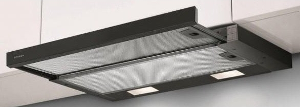 Выполнена из нержавеющей стали. Модель работает в режиме отвода и рециркуляции, имеет две галогенные лампы и выдвижную панель. Устройством легко управлять посредством ползунковых переключателей.
