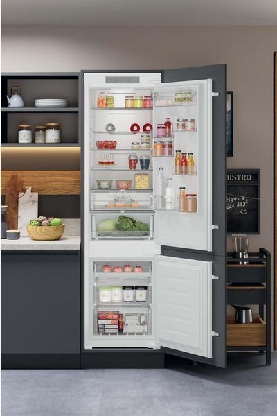Встраиваемый холодильник No Frost с нижней морозильной камерой, объем 280 л, инверторный компрессор, зона свежести, светодиодное освещение, MultiCool Flow.