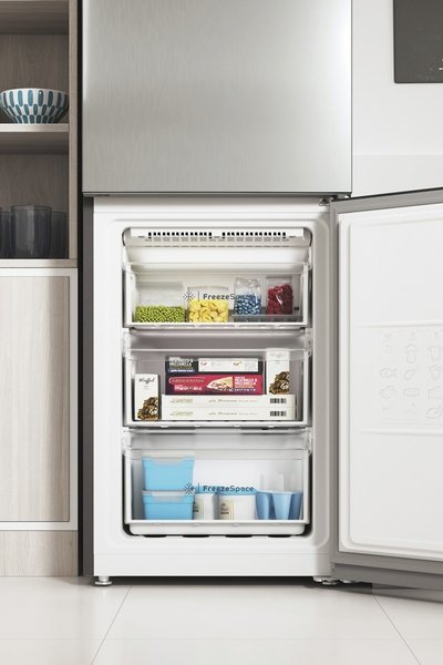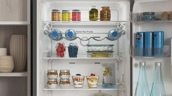 Технология Total NoFrost автоматически осушает воздух в морозильной камере, благодаря чему нет необходимости тратить время на разморозку. Кроме того, замороженные продукты не прилипают к стенкам, этикетки остаются разборчивыми, а место для хранения продуктов всегда чистым. Интеллектуальные датчики, внутри холодильной камеры, отслеживают температуру и чтобы обеспечить оптимальный уровень, необходимый для хранения продуктов.