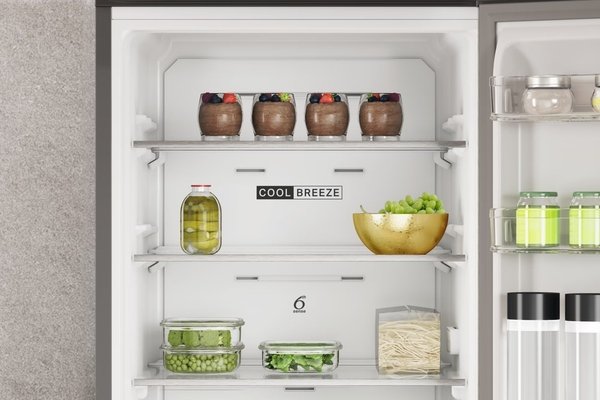 Постоянный поток воздуха в холодильнике, обеспечивает стабильную температуру на каждой полке для идеальной свежести продуктов. Храните продукты в холодильнике в любом удобном для вас месте