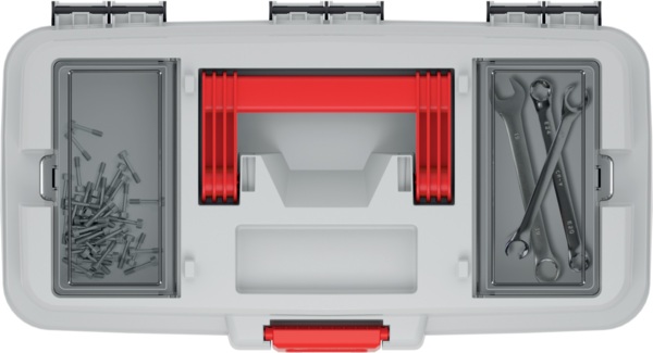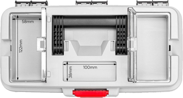 Два встроенных органайзера в крышке ящика позволяют компактно разместить мелкие инструменты и аксессуары. Прозрачные крышки органайзеров из прочного поликарбоната обеспечивают быстрый обзор содержимого. Специальный лоток для инструментов с отделением для бит поможет поддерживать порядок в вашем рабочем пространстве.