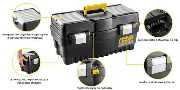 Ящик topex-133 подарила мужу, помогал выбирать тесть из того, что предлагает данный сайт. Ящик пришел удовлетворительного качества - пластик не гнется ни сам по себе, ни под весом не легкого инструмента. Так же отлично "ходят" все защелки сундука. Ручка не давит в ладонь и располагается строго по середине, позволяя распределить вес инструмента так, чтобы переносить его было удобно. Весьма удобными оказались пара органайзера внутри ящика - для мелочей типа мини-отверток, гаек, шурупов и гвоздей самое то, чтоб не потерялись. Так же у ящика имеются боковые ручки. Покупать, как мне кажется, вещь такую надо - выполнена добротно, помещаются, благодаря размеру молотки и отвертки, гаечные ключи до 30 см.