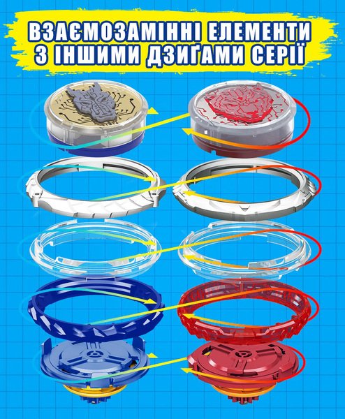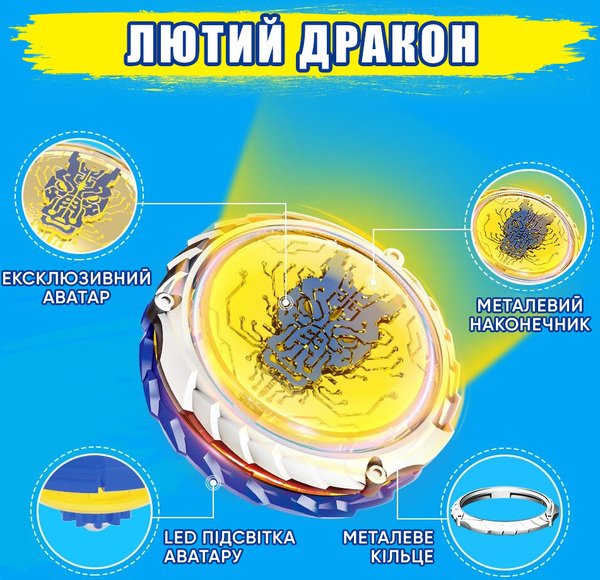 Высокие показатели волчка в поединке обеспечиваются сбалансированным сочетанием металлического кольца, устойчивого металлического основания и эксклюзивного аватара. Обновленный волчок серии Standard Pack имеет пять основных компонентов: основа с LED-подсветкой (эксклюзивный аватар Февраль Дракон), металлическое верхнее кольцо, соединительное кольцо, пластиковое нижнее кольцо и металлическое основание LED-подсветка аватара активируется при ускорении волчка и делает битву более эпической и зрелищной.