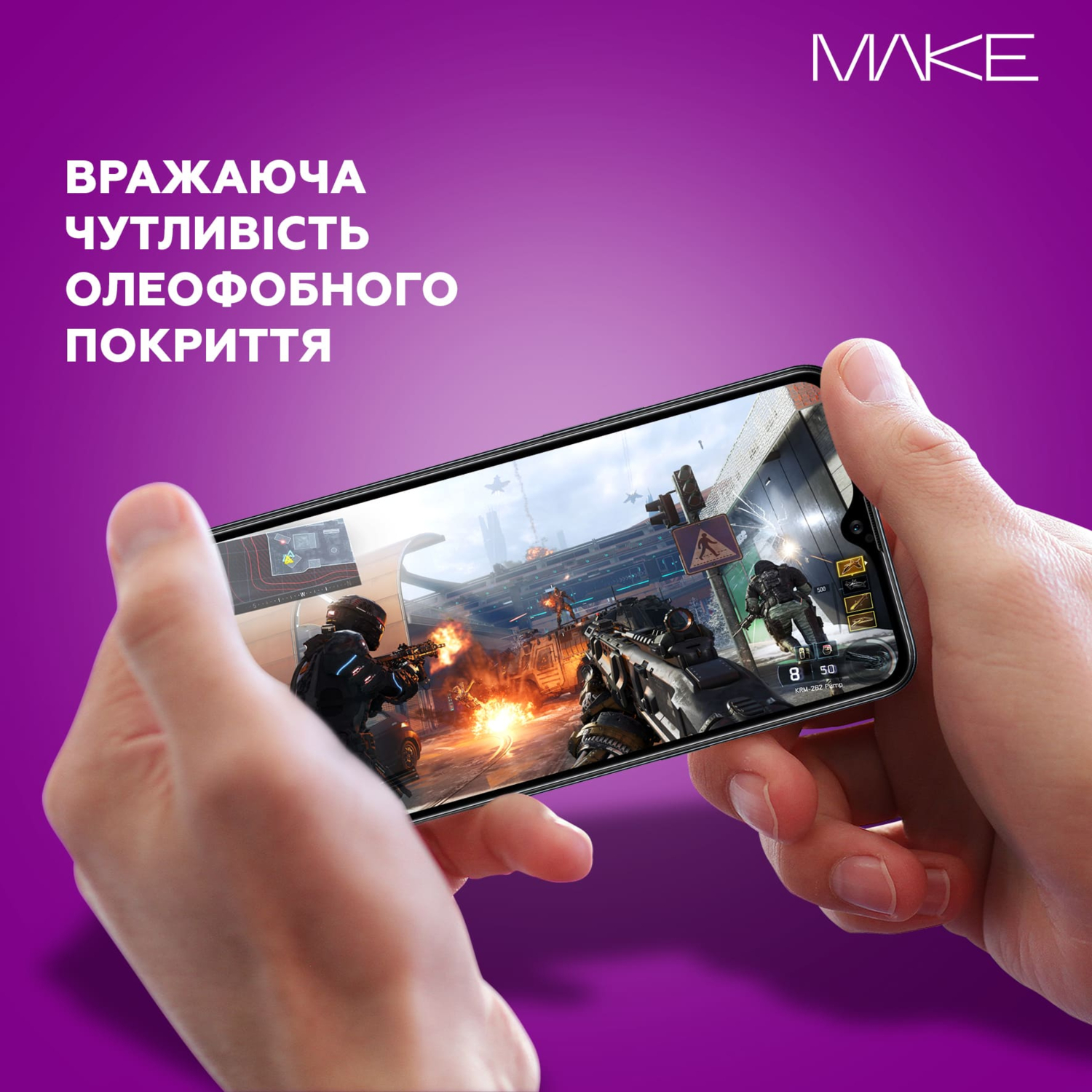 Защитное стекло make изготавливается из особо прочного алюмосиликатного стекла, содержащего оксид алюминия Al₂O₃. Материал проходит 3 этапа закалки в специальном температурном режиме, что увеличивает поверхностное натяжение стекла и делает его более устойчивым к высокому давлению, царапинам и ударам.