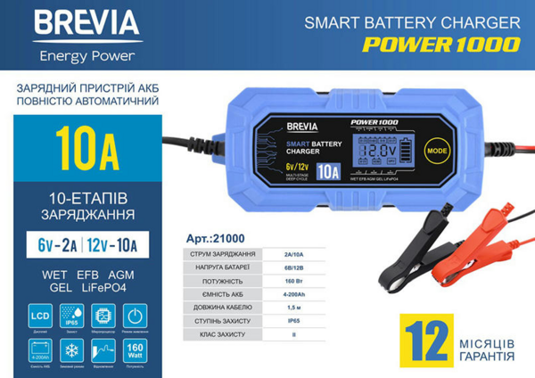 Зарядное устройство АКБ Brevia Power1000 6V/12V 10A (21000EP)