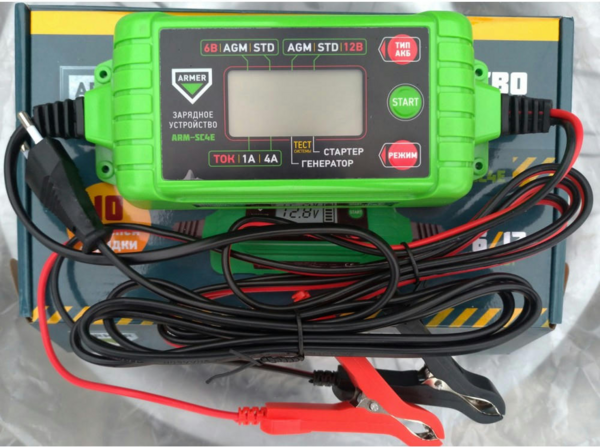 Зарядное устройство для аккумуляторных батарей, станет особенно актуально с наступлением холодной поры. Данное устройство должно быть простым в эксплуатации, обеспечивать быструю и эффективную зарядку АКБ автомобиля. Импульсное зарядное устройство Armer ARM-SC4E имеет эргономичный корпус, на лицевой стороне которого расположены все необходимые кнопки и LCD-монитор. Данное устройство обеспечивает 6 ступенчатую зарядку аккумулятора в полностью автоматическом режиме. Данное устройство подойдет, как для автомобильных аккумуляторных батарей, так и для мотоциклетных, для переключения выходного напряжения достаточно выбрать кнопкой соответствующий режим 6В или 12В, которая находится на передней панели. Огромным преимуществом данного импульсного устройства является функция тестирования батареи и генератора автомобиля, без подключения к сети переменного тока.